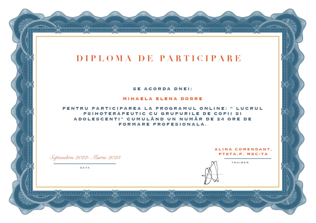 - Lucrul Psihoterapeutic cu Grupurile de copii și adolescenți – Alina Comendant, Psihoterapeut (CTA-P) – 2023