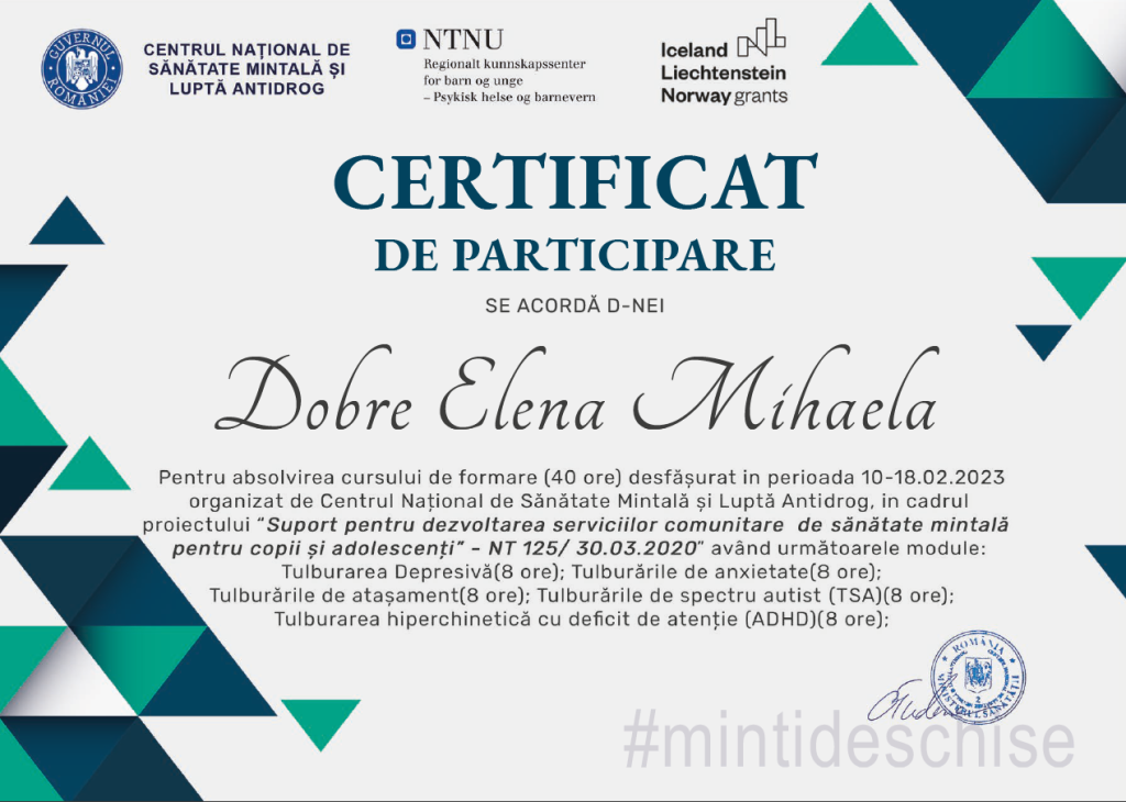 - Programe de Intervenție în Psihologia Clinică a Copilului: de la Conceptualizarea Cazului la Design și Implementare – Asociația Institutul de Psihologia Dezvoltării – 2023