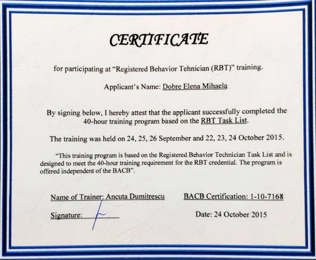 - Tehnician Comportamental Autorizat (RBT) – BACB Gateway – 2015