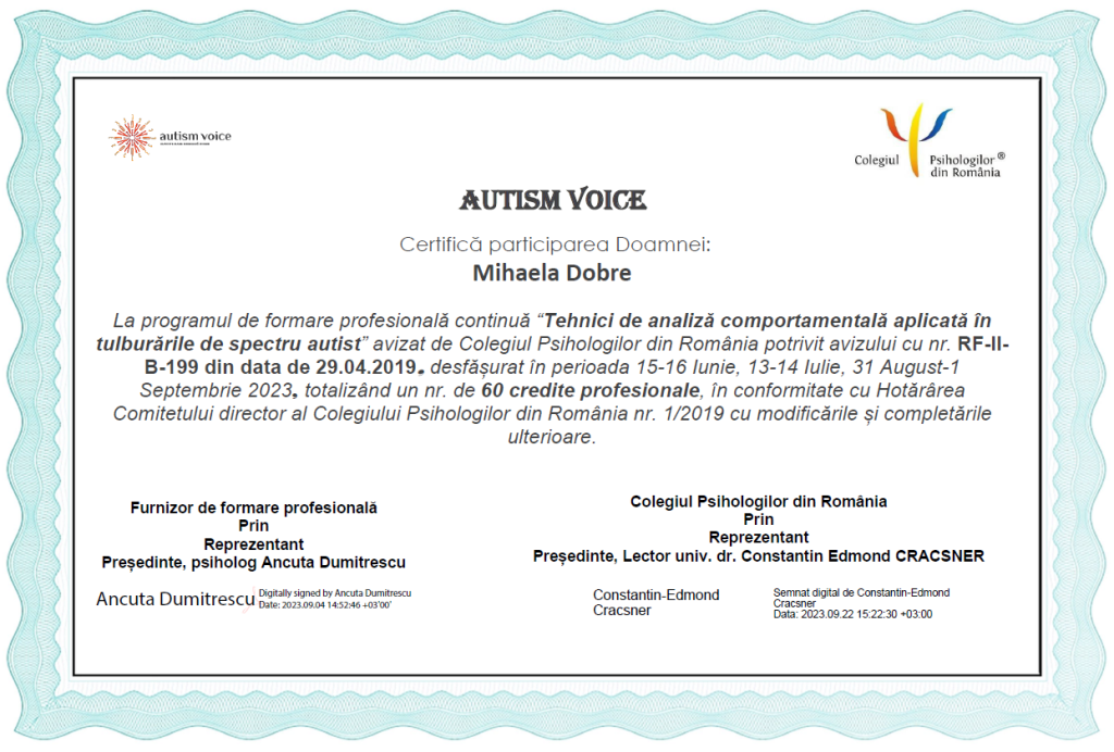 - Tehnici de analiză comportamentală aplicată în tulburările de spectru autist – Autism Voice – 2023